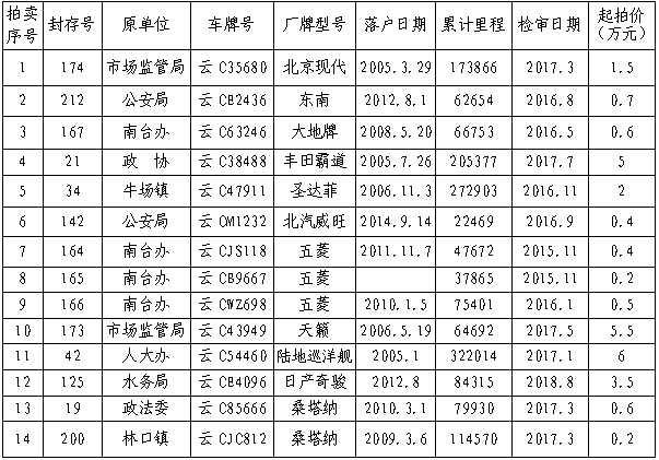 經(jīng)鎮(zhèn)雄縣人民政府批準,公開拍賣鎮(zhèn)雄縣公務(wù)用車改革取消車輛(第三期)14輛。相關(guān)事項如下:
