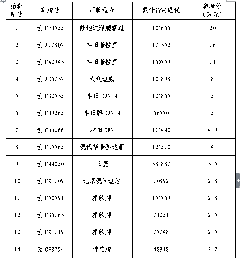 經(jīng)鎮(zhèn)雄縣人民政府批準(zhǔn),受鎮(zhèn)雄縣國有資產(chǎn)管理局委托,公開拍賣鎮(zhèn)雄縣公車20輛。以輛為單位拍賣。相關(guān)事項如下: