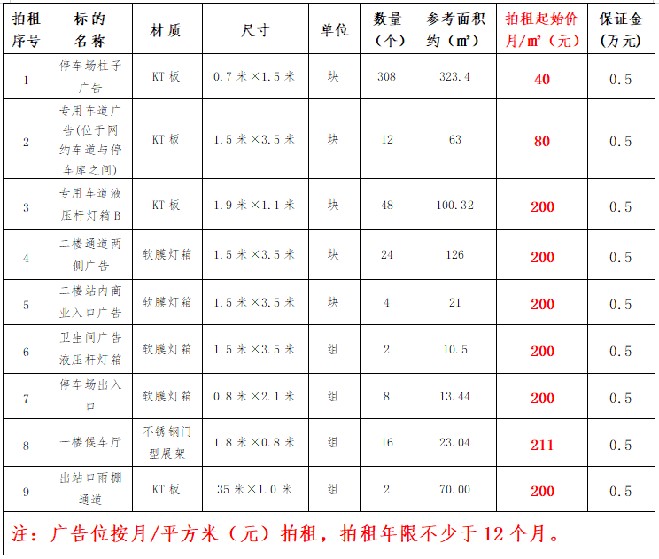 (二)拍租鎮(zhèn)雄縣開元商業(yè)物業(yè)服務(wù)有限公司以勒高鐵站站前廣場各類廣告位使用權(quán),詳見下表: